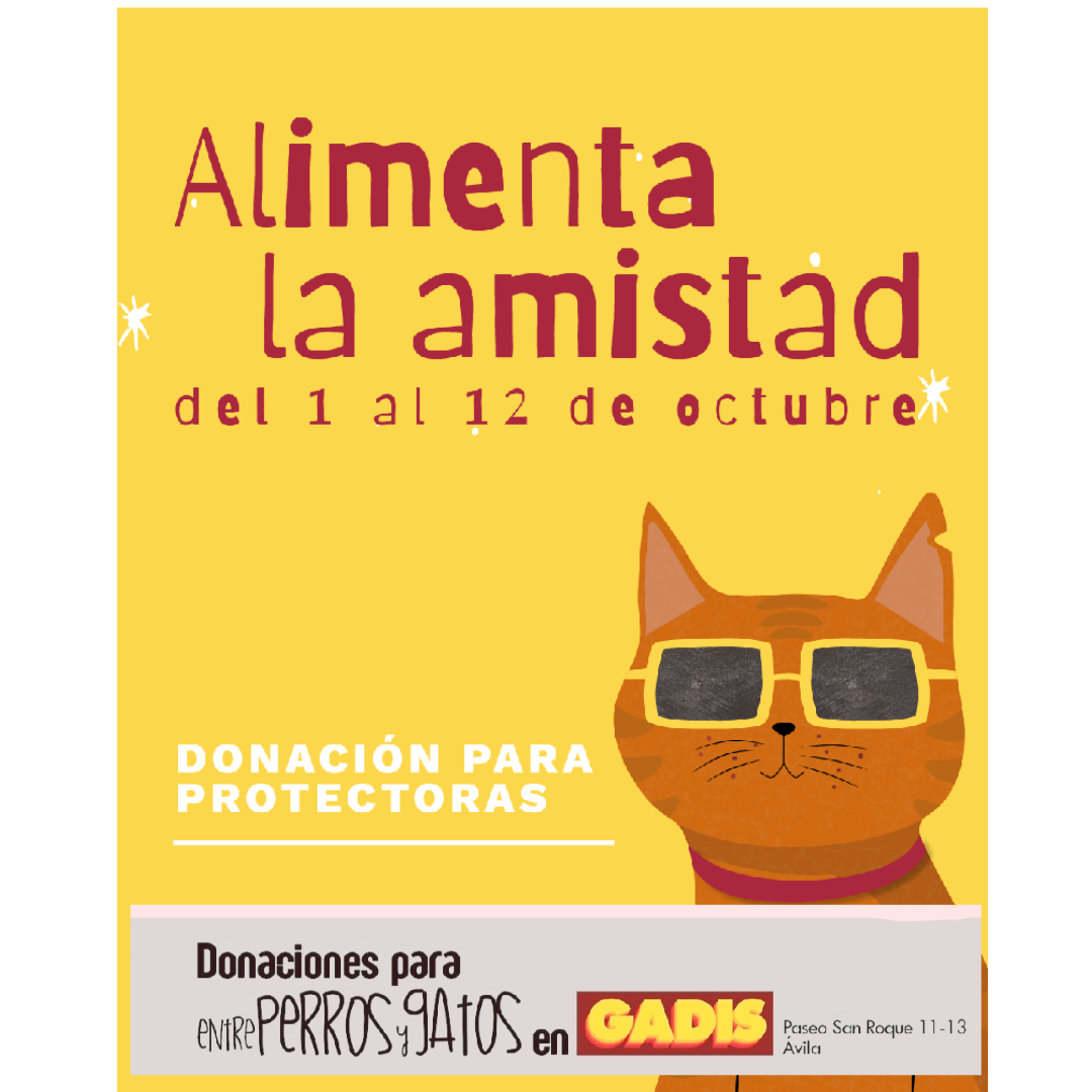 Del 1 al 12 de octubre de 2025, los clientes del supermercado Gadis de Paseo San Roque 11-13 (Ávila) podrán colaborar aportando alimentos, productos de higiene o donaciones económicas al pasar por caja. Todo lo recaudado se destinará a mejorar el cuidado de los animales acogidos en nuestra protectora.